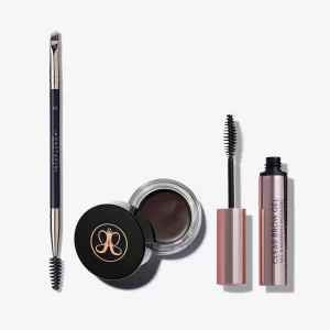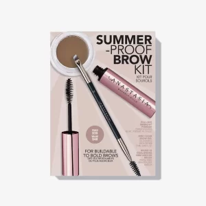 Summer-Proof Brow Kit is the perfect trio for creating perfectly defined. long-wearing brows every time. Start with DIPBROW? Pomade. a full-pigment. waterproof eyebrow pomade to help fill in and detail eyebrows. The long-lasting. buildable formula glides on smoothly to skin and hair and allows time for blending before drying down completely to a matte finish. Achieve everything from natural-looking hair like texture to bold outlining and filling for more dramatic brow looks. Use with Brush 12. a tapered. angled eyebrow brush with firm synthetic fibers. Ideal for applying DIPBROW? Pomade with professional-quality precision. this densely packed duo brush creates hairlike strokes while the custom spoolie brush blends the product for a flawless finish. Finish with Mini Clear Brow Gel. a lightweight clear eyebrow gel that sets brow color and holds brow hair in place for a clean. polished look that lasts.